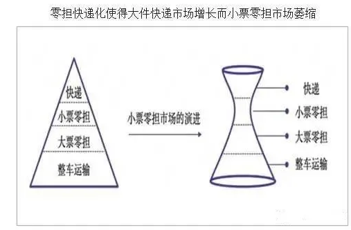 隨著整個(gè)社會物流體系不斷進(jìn)步,企業(yè)對物流供應(yīng)鏈要求越來越高——降低庫存水平、提高供應(yīng)鏈響應(yīng)速度、物流運(yùn)輸需求碎片化等。高時(shí)效、小批量、高頻次的需求不再是快遞的專屬,零擔(dān)行業(yè)也派生出相關(guān)需求,零擔(dān)快遞化(即用快遞的操作形式和行業(yè)標(biāo)準(zhǔn)去執(zhí)行零擔(dān)的配送)趨勢開始出現(xiàn)。因此大件物流行業(yè)增長的另外一部分來自零擔(dān)快遞化,最終表現(xiàn)為零擔(dān)市場逐步萎縮,而大件物流市場持續(xù)增長。